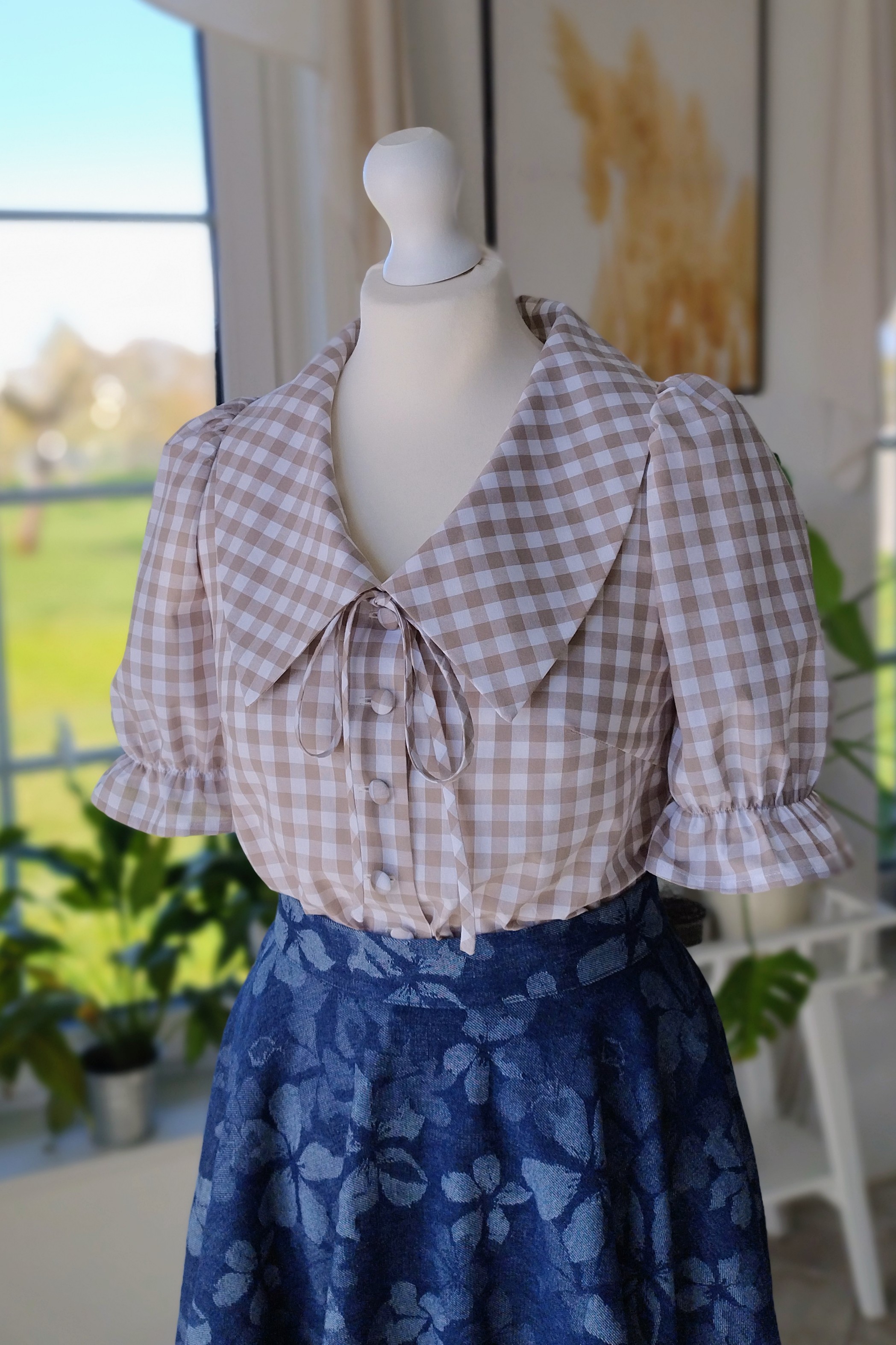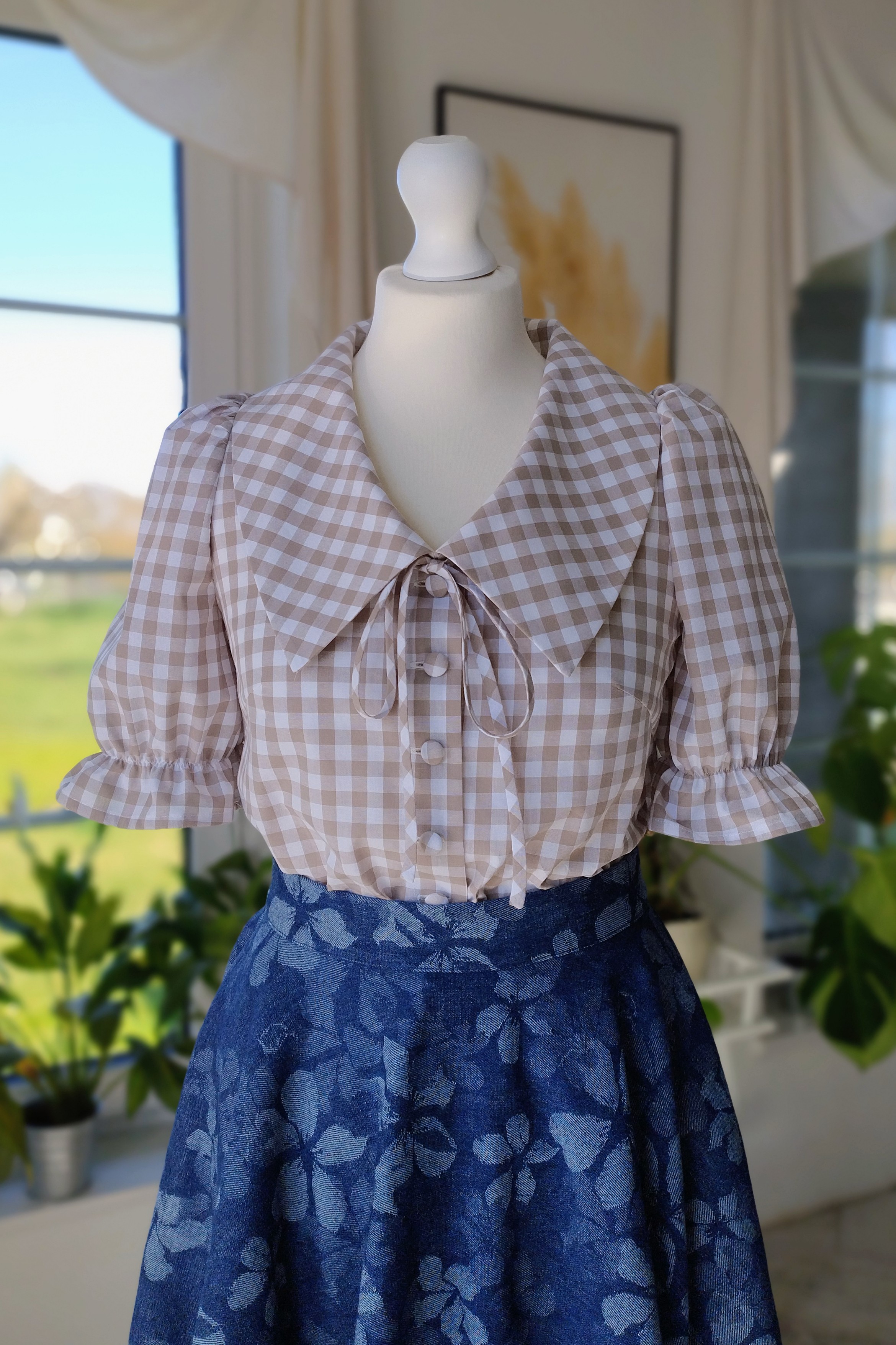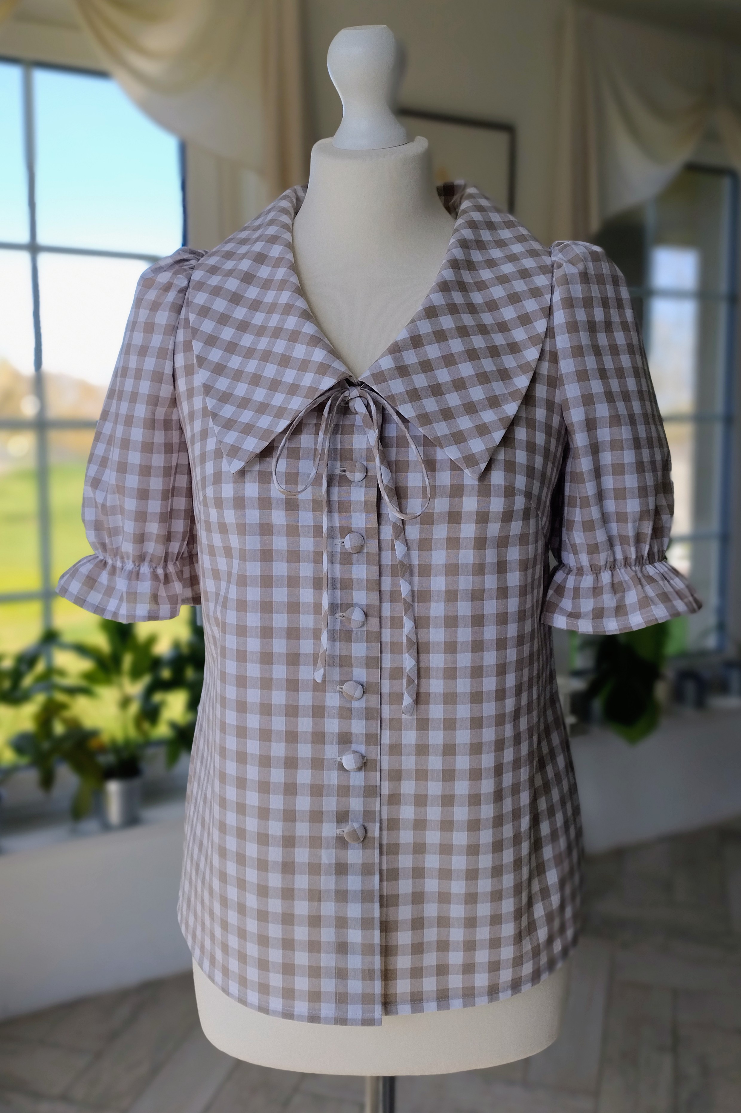Model wyróżnia się dużym kołnierzem, który pięknie układa się na ramionach, oraz dekoracyjnym wiązaniem przy dekolcie, dodającym całości lekkości i romantycznego charakteru. Krótkie rękawy z delikatnym marszczeniem i falbanką nadają sylwetce subtelnej objętości, a rząd oblekanych guzików podkreśla staranne wykończenie.