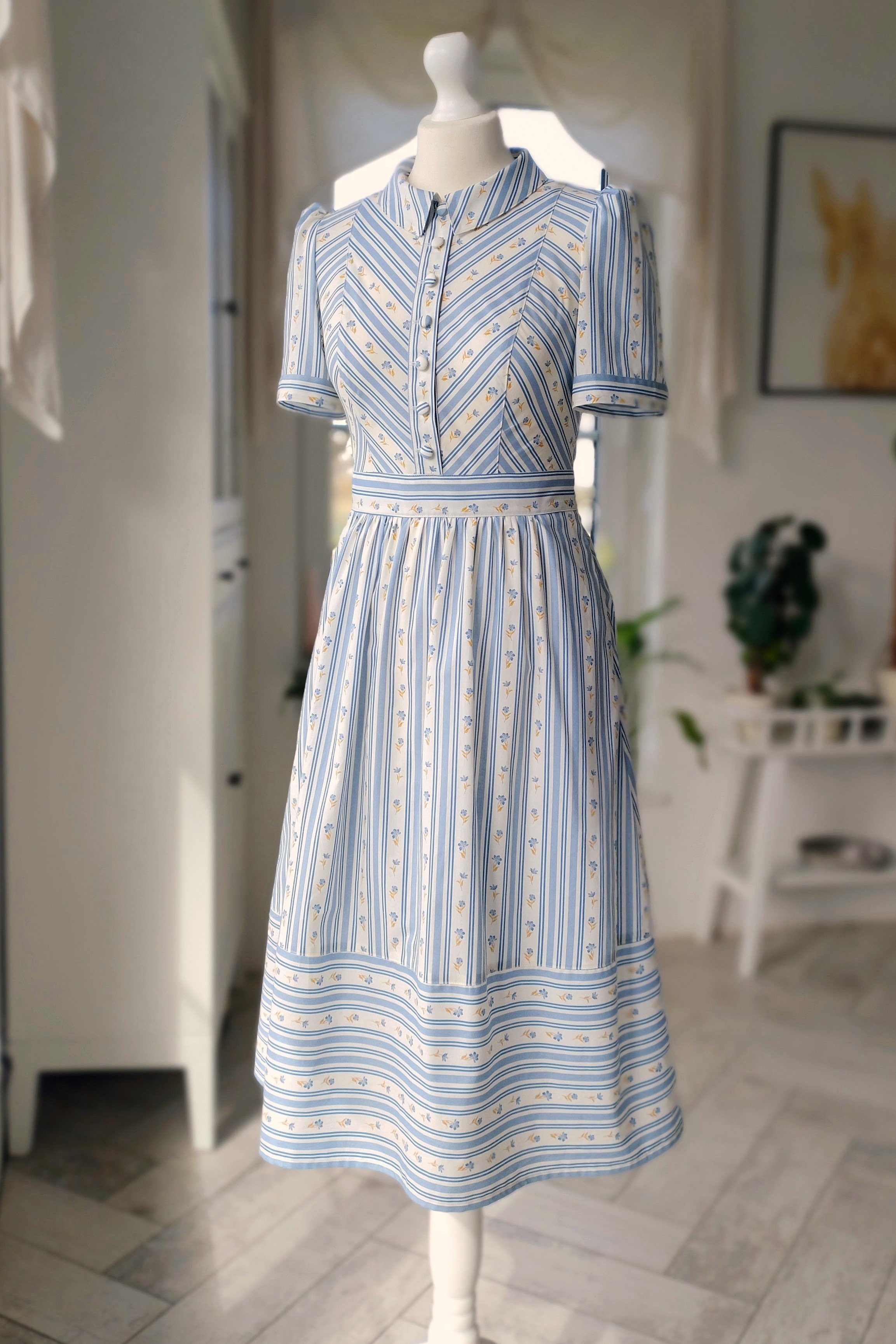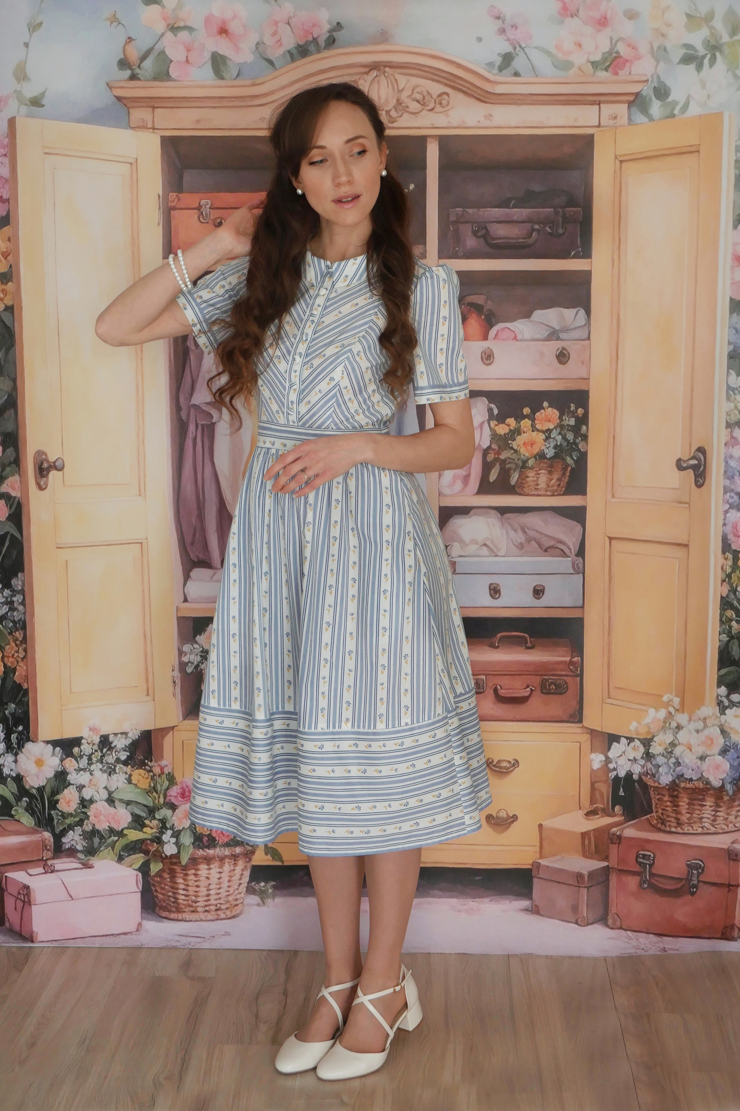 Sukienka Florentyna zachwyca subtelnym urokiem i delikatną grą wzorów, które przywodzą na myśl letni poranek wśród kwitnących łąk. Błękitne paski przeplatają się z drobnymi kwiatami, tworząc harmonijną, niezwykle kobiecą kompozycję.