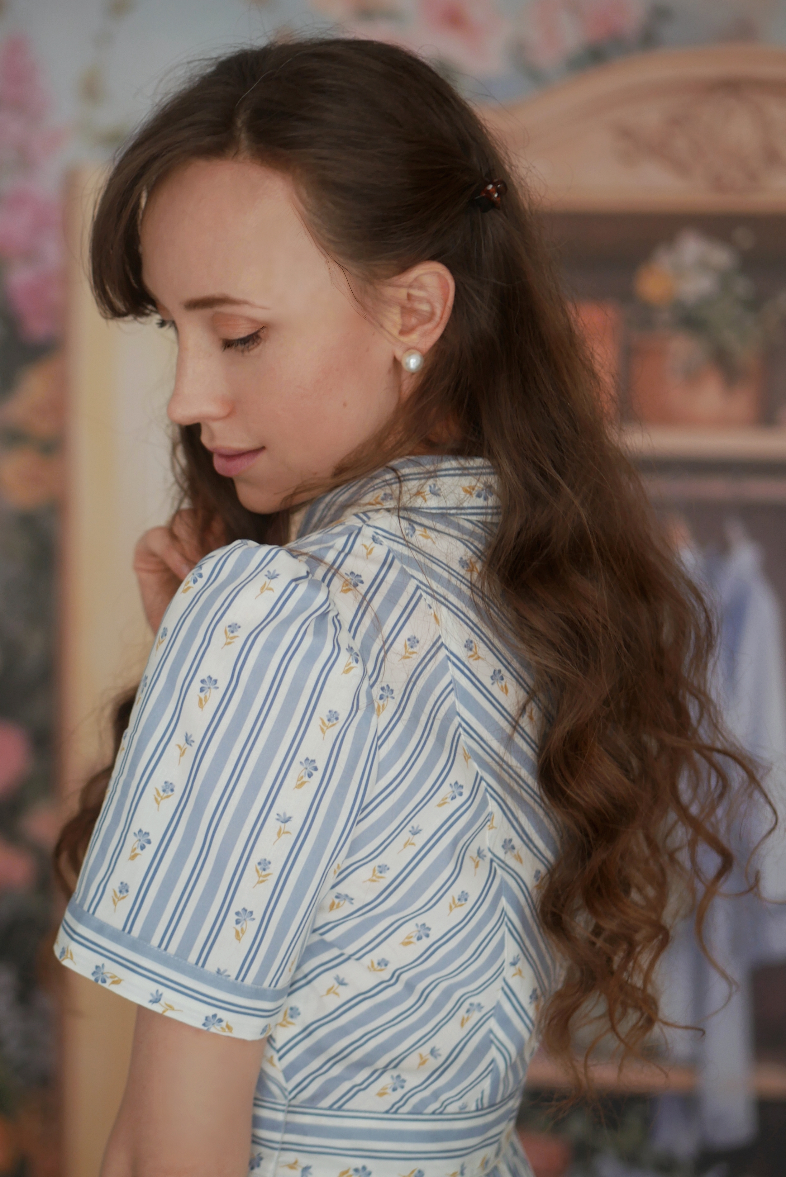 - romantyczny wzór w paski przełamany drobnymi kwiatami
