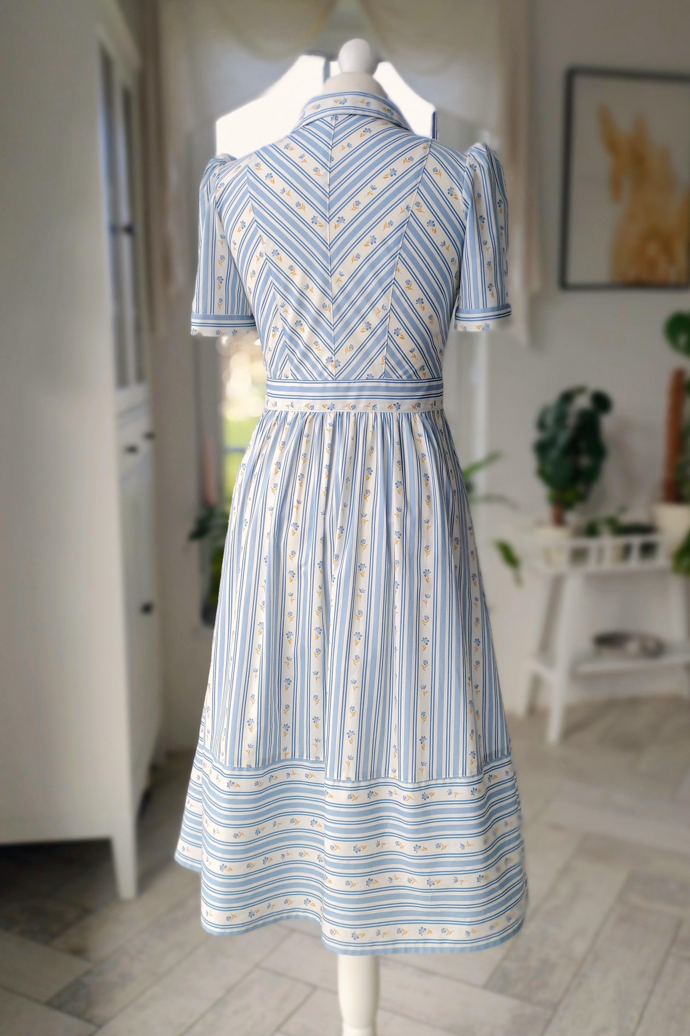 Góra sukienki została ozdobiona paskami układającymi się w miękką jodełkę, które delikatnie zbiegają się ku środkowi, podkreślając linię talii i nadając sylwetce lekkości. Ten subtelny rytm linii pięknie współgra z klasycznym kołnierzykiem i rzędem drobnych guziczków, dodając całości elegancji z nutą vintage.